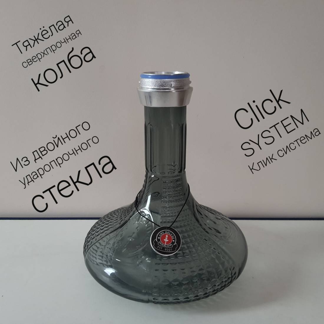 1. Колба для кальяна сделана из сверхпрочного двойного ударопрочного стекла. Это действительно одна из самых надёжных колб. Эту модель полюбили в кальянщики. Кроме этого она ещё и очень тяжёлая и устойчивая. Соединение с шахтой происходит с помощью клик системы.