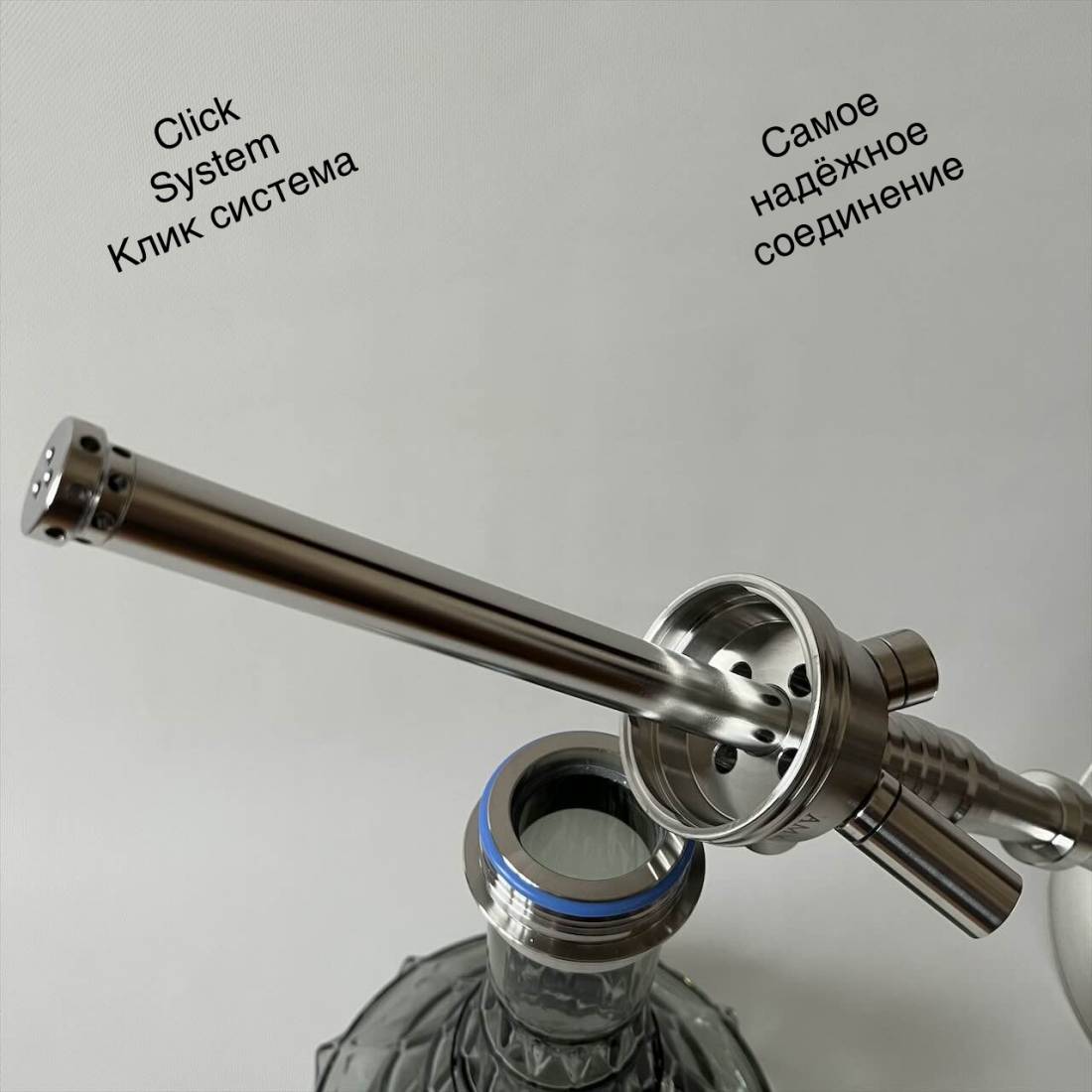 6. Клик система - Click SYSTEM это соединение колбы кальяна с шахтой. Одно из самых популярных и очень надёжных соединений. Учитывая что все металлические элементы кальяны сделаны из пищевой нержавеющей стали, можно сделать заключение что клик система прослужит Вам годами. Дело в том что пищевая нержавейка очень плотная и практически не стирается.