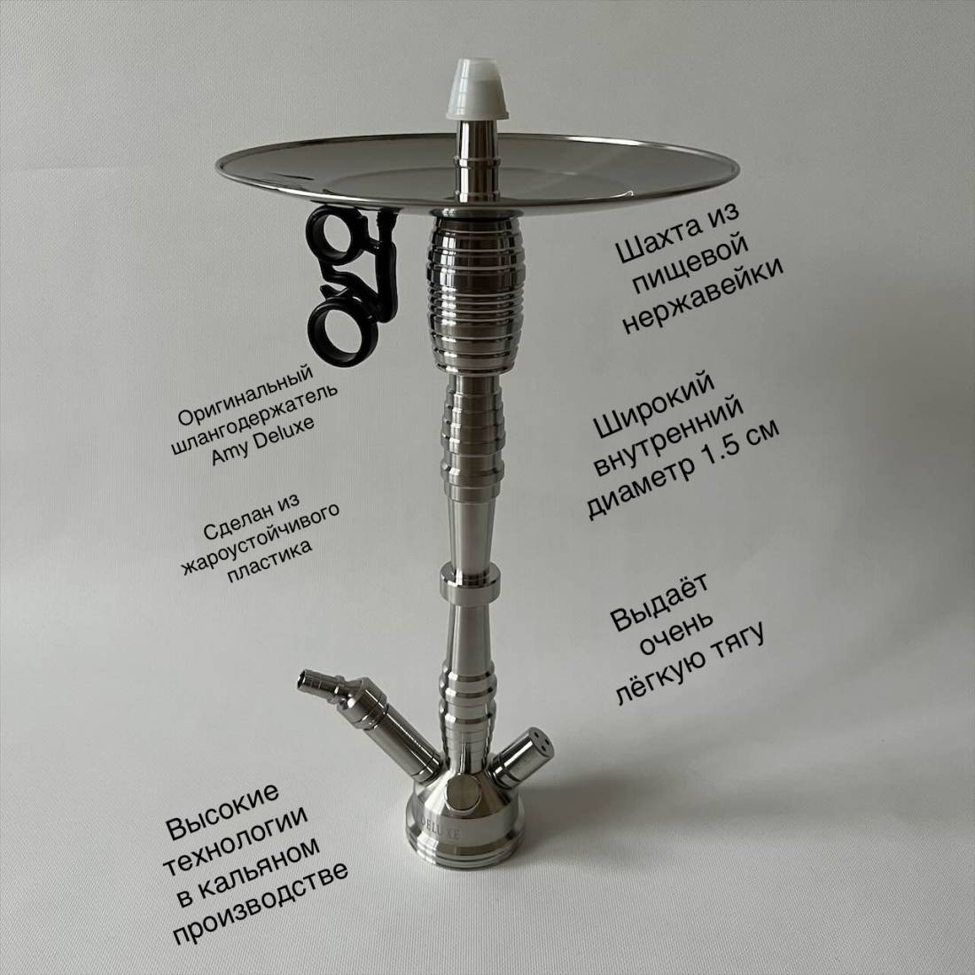 1. Абсолютно любая вещь имеет ценность если она сделана из материалов высокого качества. Шахта для кальяна Amy Deluxe SS 20.01 сделана из пищевой нержавеющей стали. Над её производством работали инженеры, которые высчитали какой должен быть внутренний диаметр шахты, вес и так далее. Поэтому Мы имеет продукт высочайшего качества с легкой и самое главное правильной тягой.