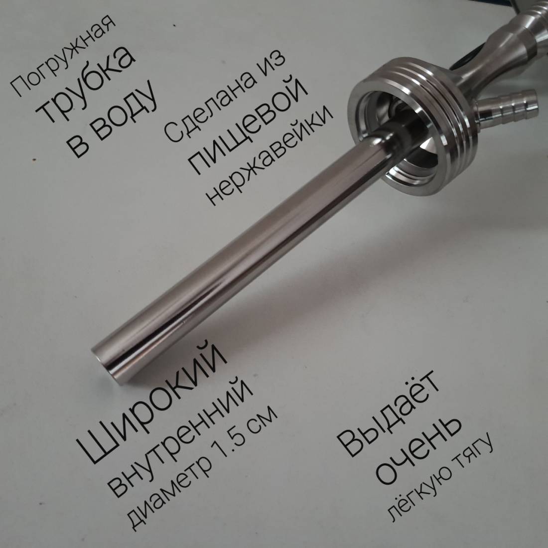 9. Погружная трубка в воду сделана из пищевой нержавеющей стали.  Имеет внутренний диаметр 1.5 см. Выдаёт очень лёгкую и приятную тягу.  Рекомендуем погружать в воду трубку примерно на 1 сантиметр.