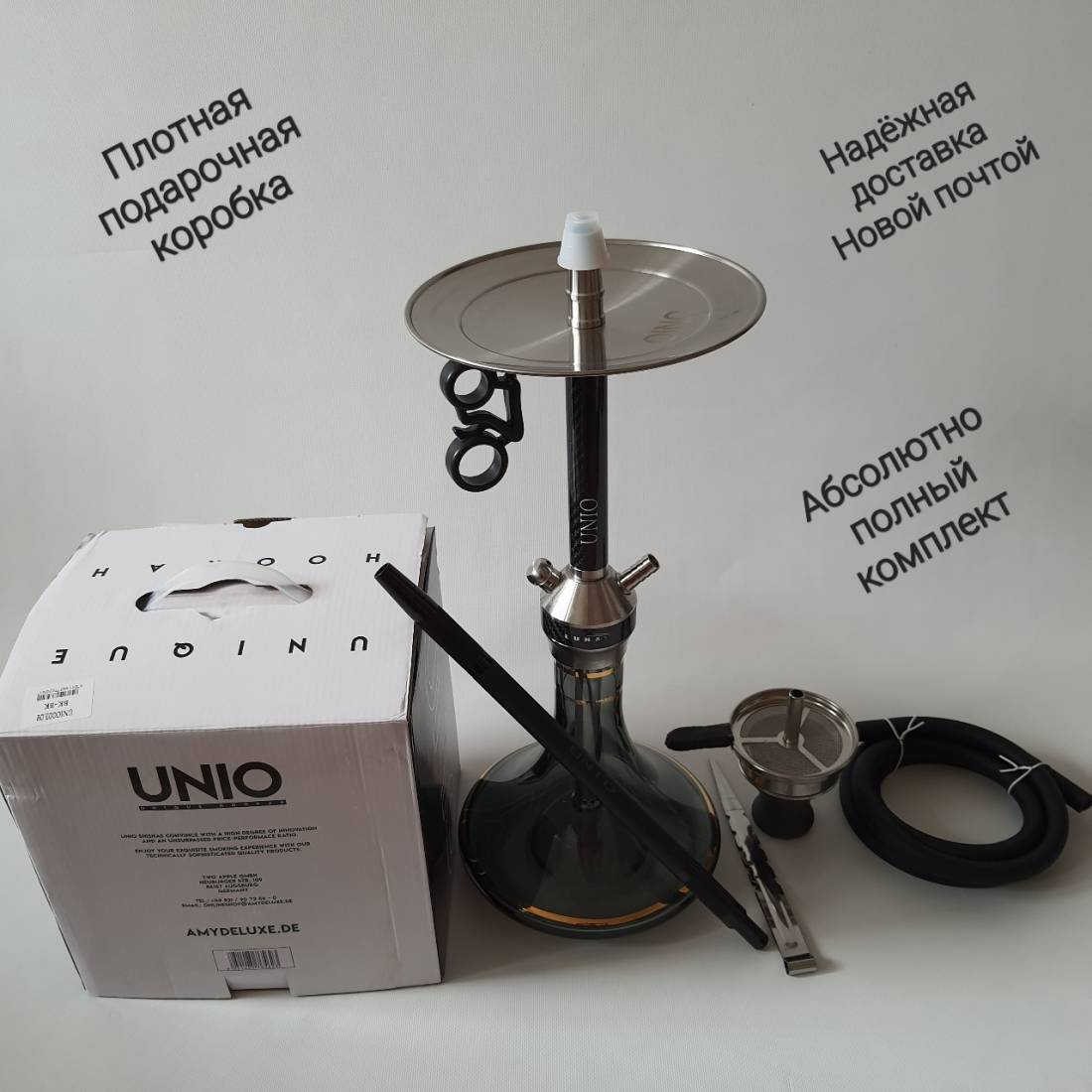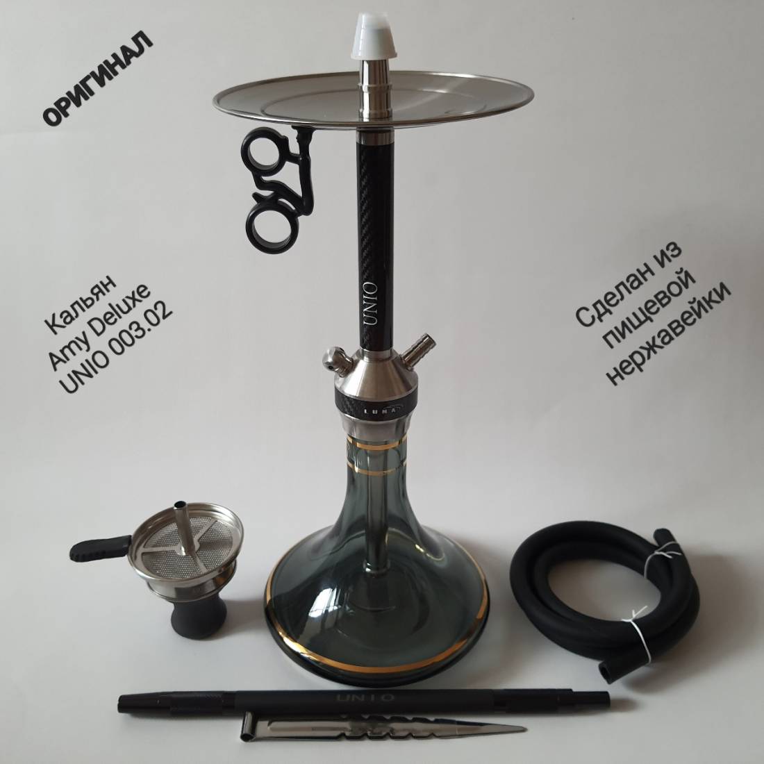 8. Оригинальный кальян Amy Deluxe UNIO 003.02 имеет абсолютно полный комплект. Вы можете сразу же после покупки использовать кальян по назначению. Не забывайте перед первым использованием продуть шахту и шланг от Себя. Иногда остаются мелкие части и пыль. И для полного использования Вам понадобится табак и уголь для кальяна.
