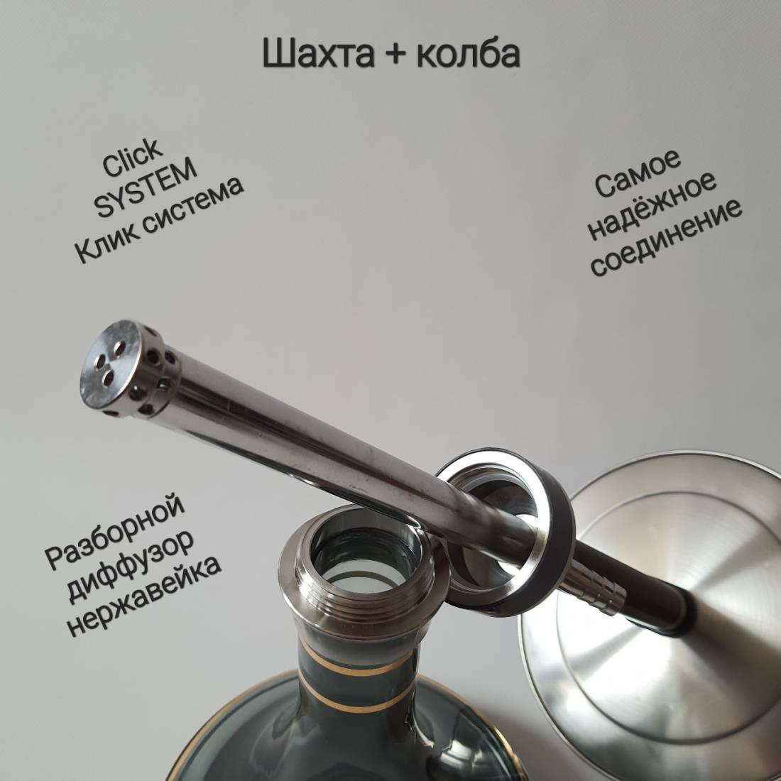 6. Колба + шахта соединяет Click SYSTEM Клик система. Очень надёжное соединение. Особенно Клик система нравится кальянщикам, потому что очеь быстро происходит сборка и разборка кальяна. Так же следует отметить высокую прочность этого соединения.
