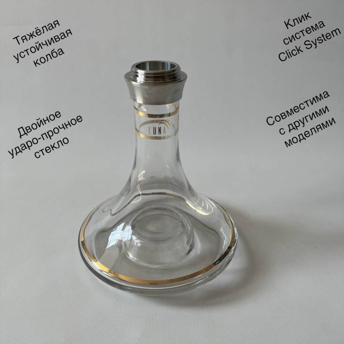 2. Колба для кальяна сделана из ударопрочного стекла. Очень устойчивая и тяжелая.  Соединяется с шахтой Клик системой Click System. Колба прозрачная, поэтому в ней легко контролировать количество жидкости.