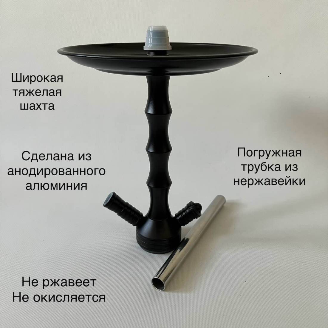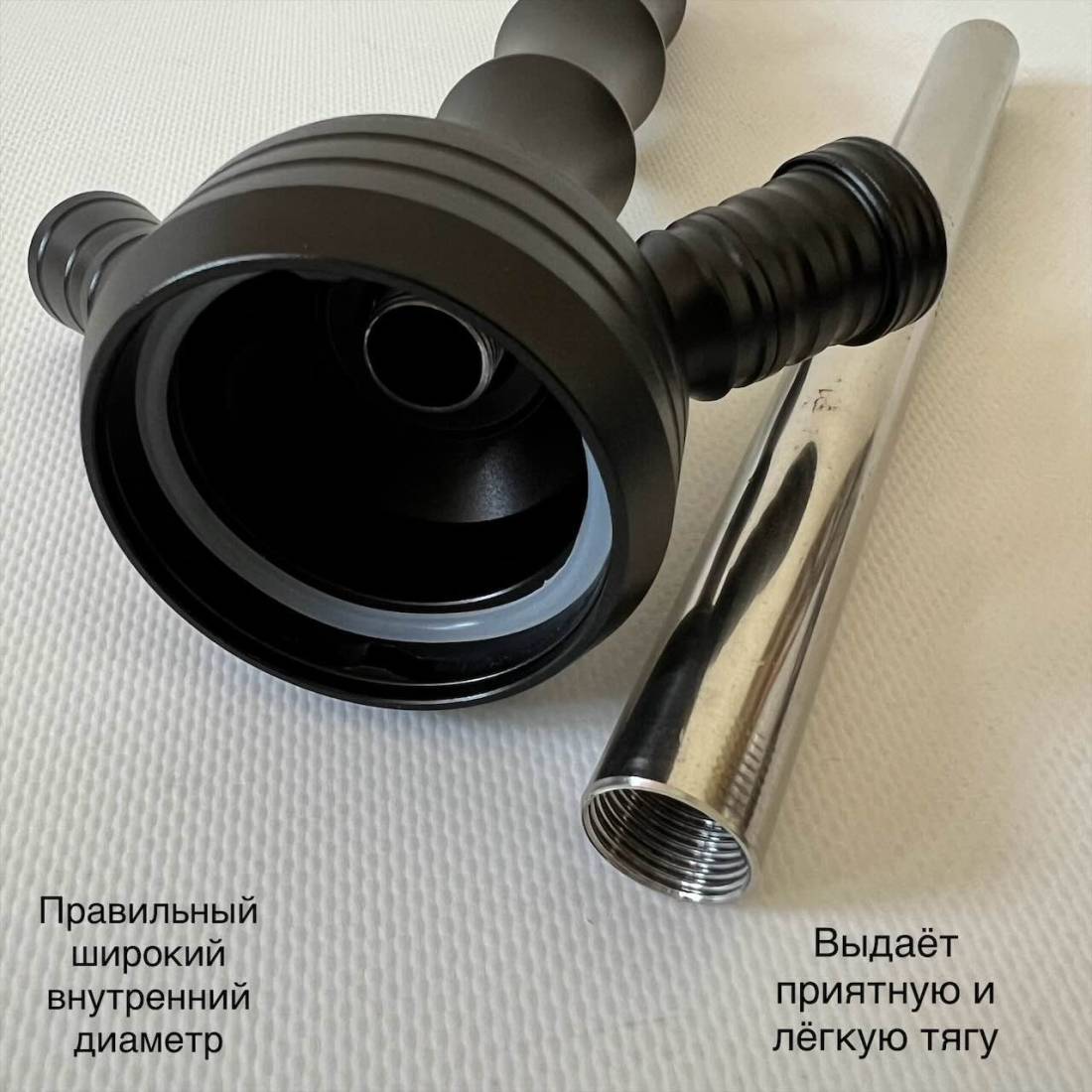 4. Шланг для кальяна сделан из пищевого силикона. Огромный плюс в том, что он абсолютно не сгибается во время использования, но в тоже время очень гибкий и приятный на ощупь. Мундштук сделан из анодированного алюминия. Состоит из 3 частей.