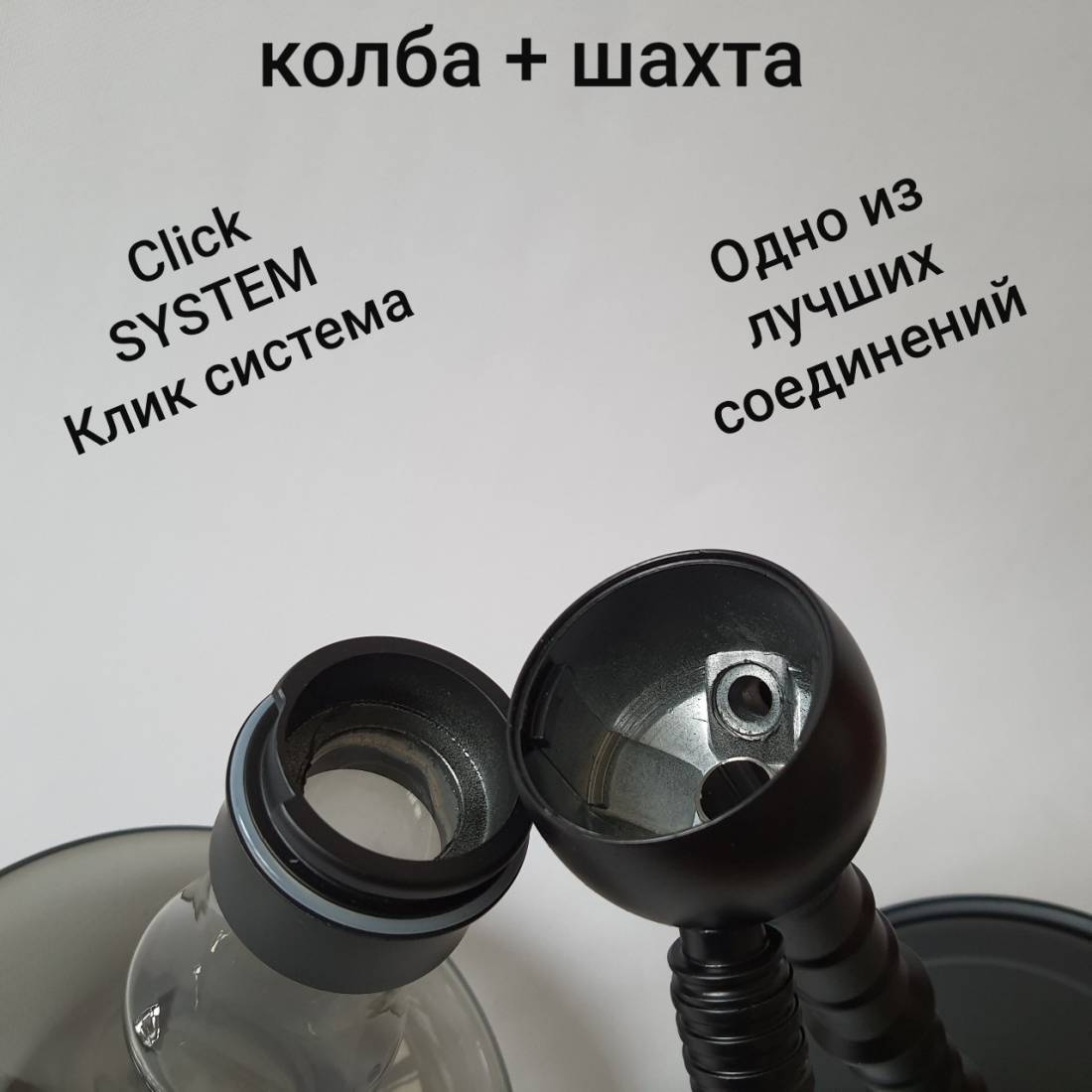 5. Колба для кальяна сделана из двойного ударопрочного стекла. Очень тяжёлая и устойчивая. Соединяется с шахтой Click SYSTEM Клик системой. Колба прозрачная. В ней полностью видно количество жидкости.