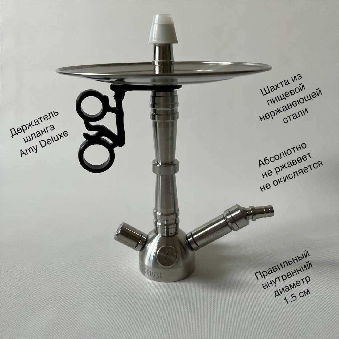 1. Шахта у представленной модели сделана из пищевой нержавеющей стали. Это ставит кальян в серию ПРЕМИУМ, и гарантирует очень длительный срок службы. На шахту смело можно давать пожизненно гарантию. Над её разработкой работали инженеры компании Amy, поэтому шахта для кальяна имеет правильный внутренний диаметр, что делает курение кальяна приятным и самое главное не вредным