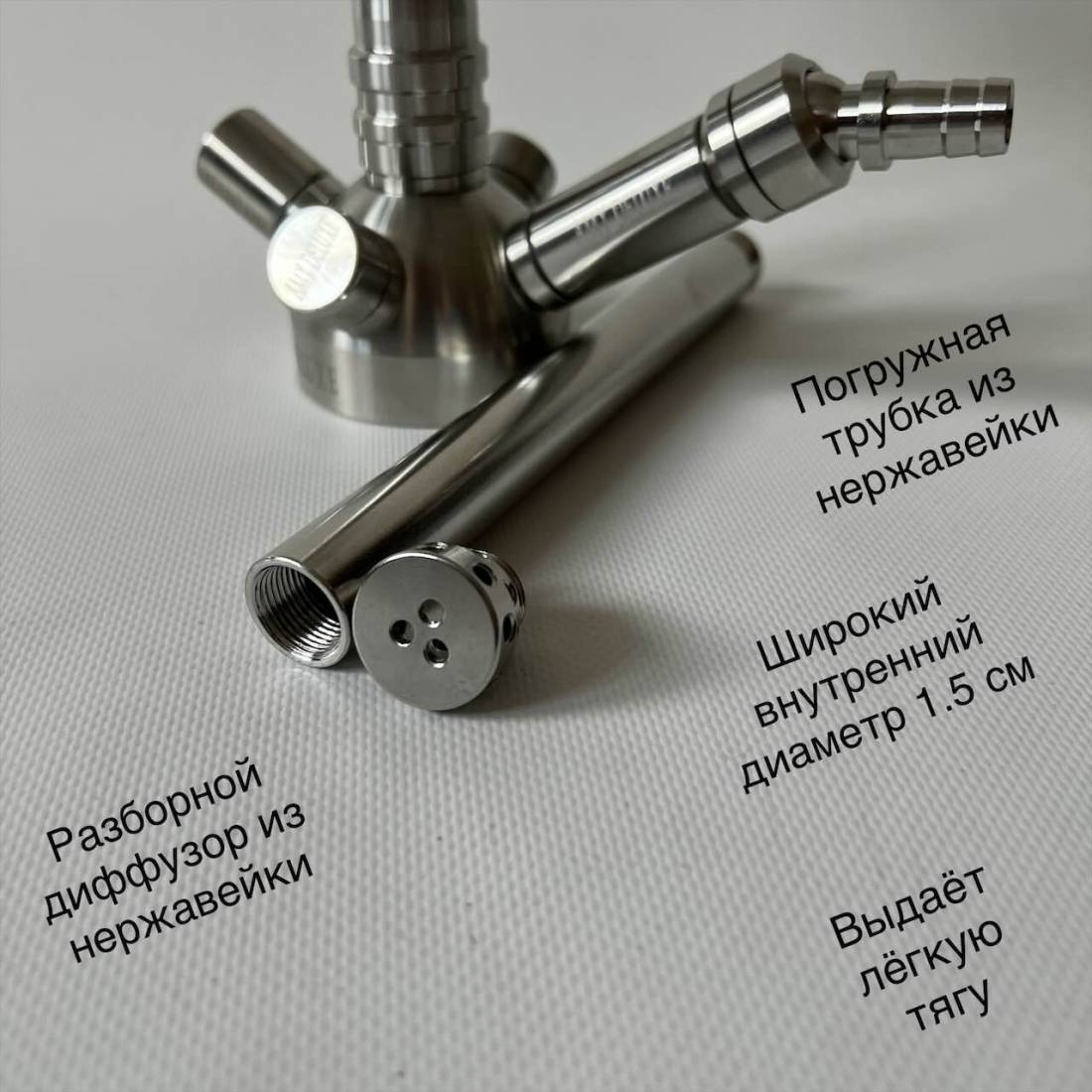 8. Разборной диффузор из пищевой нержавеющей стали идёт в комплекте. Ваш кальян будет работать намного тише, и пропадут большие воздушные шарики. Погружная трубка в воду с широким и правильным внутренним диаметром 1.5 см выдаёт очень лёгкую тягу.