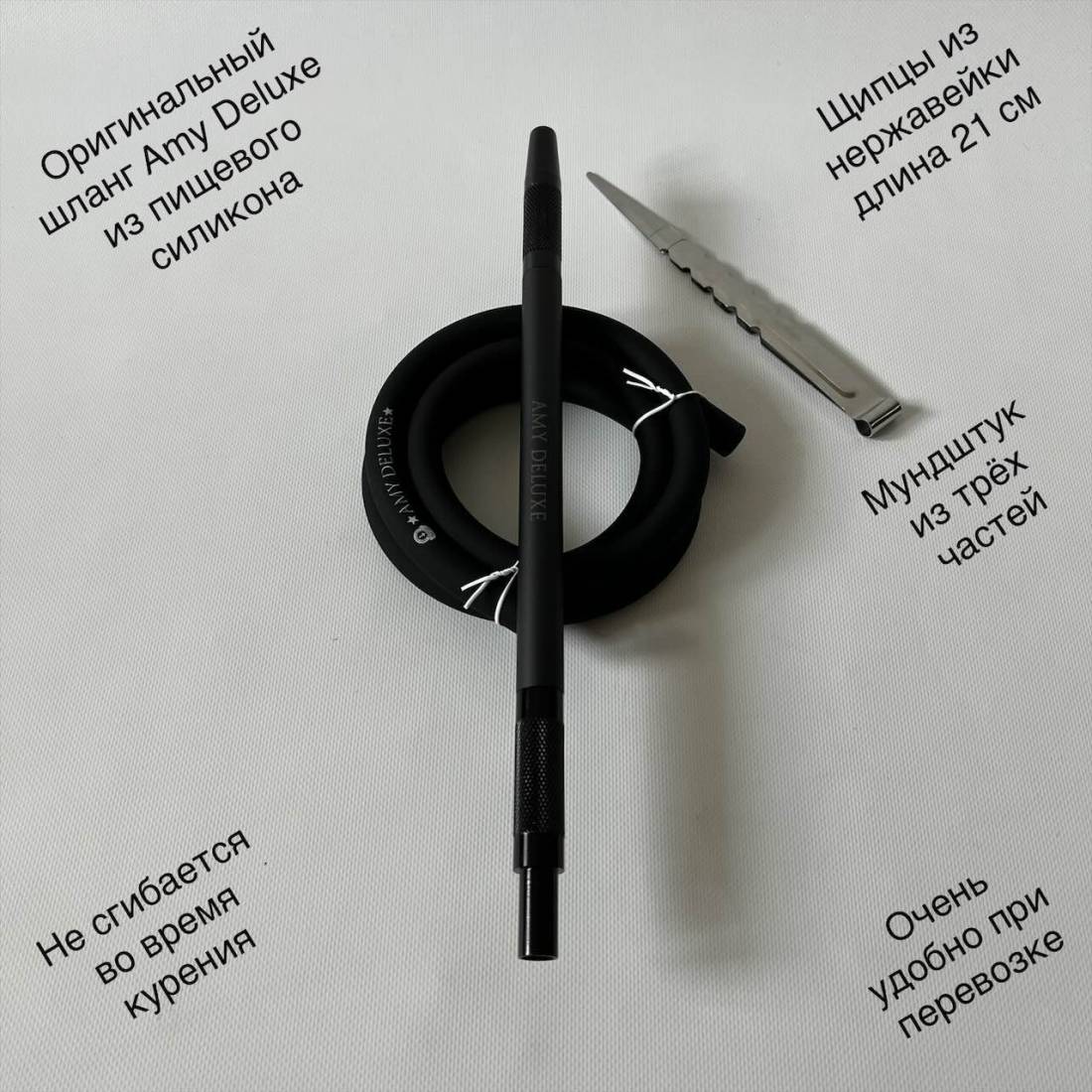 3. Огромную роль играет шланг для кальяна. Он сделан из пищевого силикона, имеет правильный внутренний диаметр. Тяга с помощью такого шланга очень легкая, что очень любят многие любители кальяна. Кроме этого шланг имеет самое главное преимущество: он абсолютно не сгибается во время курения кальяна.