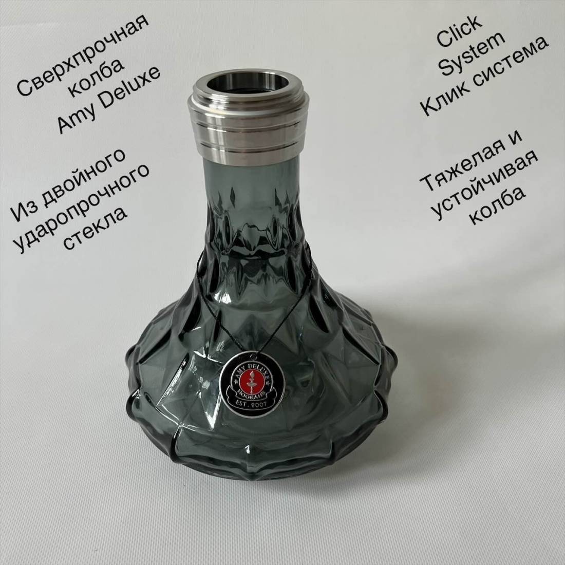 2. Огромный плюсом является колба для кальяна, почему? У представленной модели Сверхпрочная и очень тяжёлая колба. Сделана из двойного ударопрочного стекла. Соединяется с шахтой клик системой. Колба со стороны кажется тёмной но на самом деле она прозрачная. В ней легко контролировать количество воды. Совместима с другими моделями кальянов Amy Deluxe SS