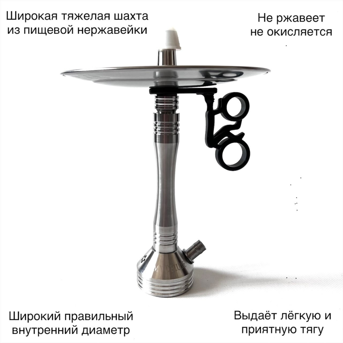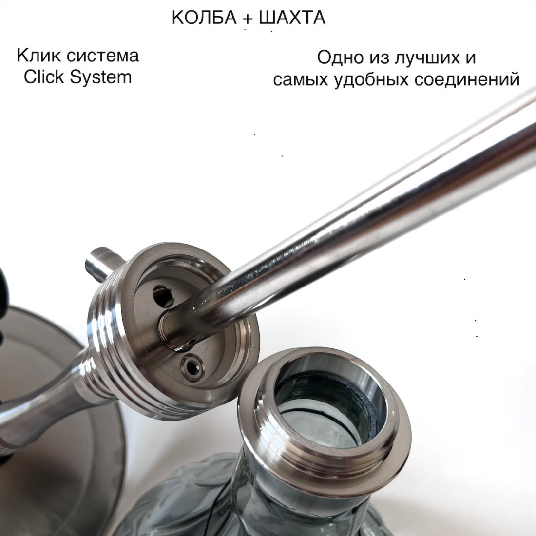1. Абсолютно все металические элементы, в том числе и шахта сделаны из пищевой нержавеющей стали. Широкий и правильный внутренний диаметр это гарантии лёгкой и приятной тяги. Шахта тяжёлая, поэтому охлаждение будет отличное. Вкусопередача на высоком уровне. Шахта с колбой соединяется клик системой, Click System. Среди любителей и профессионалов кальяна считается самым удобным для использования.