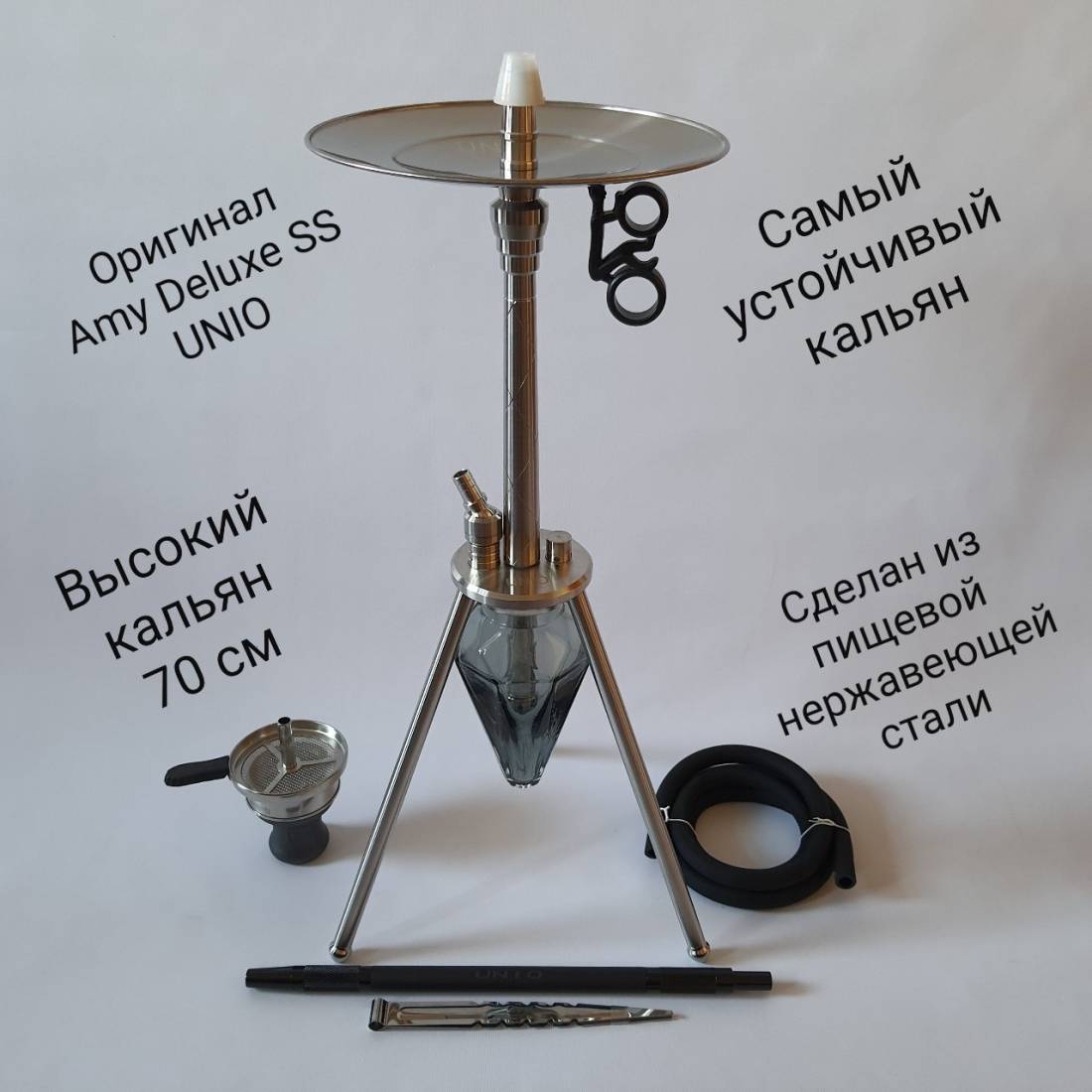 1. Качество любого товара в первую очередь зависит от того, с каких материалов он сделан. Представленный кальян Amy Deluxe UNIO 001.01 сделан из пищевой нержавеющей стали. Этот факт ставит данный кальян в премиум сегмент. Абсолютно все металлические части сделаны из пищевой нержавейки.