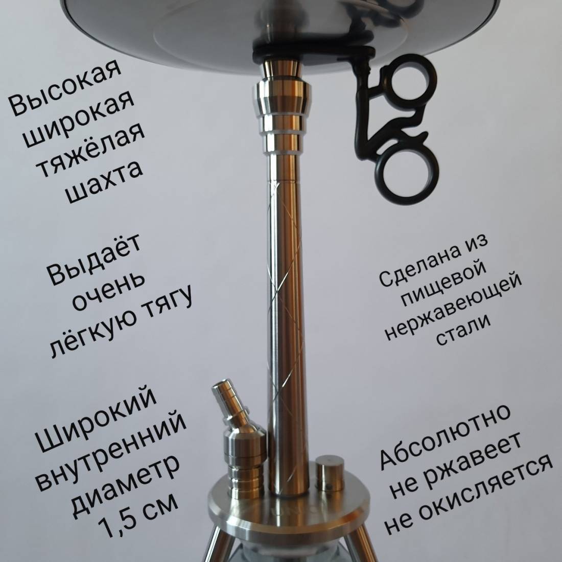 3. Шахта для кальяна UNIO 001.01 сделана полностью из пищевой нержавейки. Имеет широкий правильный внутренний диаметр. Выдает очень лёгкую и приятную тягу, что оценят все любители кальяна. Шахта довольно тяжелая. Поэтому охлаждение у кальяна правильное, а это улучшает вкусопередачу, что очень нравится любителям покурить кальян.