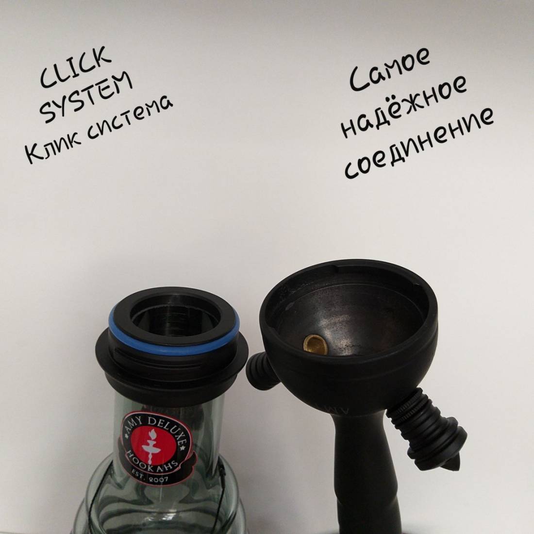 8. CLICK SYSTEM Клік система з'єднує колбу Amy Deluxe 690 із шахтою. На сьогоднішній день це одна з найнадійніших сполук. Ця технологія належить компанії AMY. Її дуже люблять у кальянних закладах, бо вона служить довше ніж різьблення.