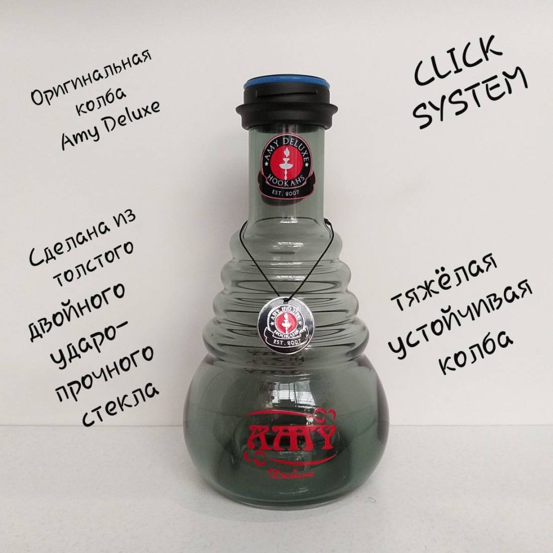 1. Колба для кальяну Amy Deluxe 690 з'єднується з шахтою клік системою. Дуже важка та стійка. Зроблена з товстого, подвійного, ударостійкого скла. Оригінальний дизайн у стилі HIGH TECH відразу ж впадає у вічі. Сумісна з багатьма кальянами Amy Deluxe.