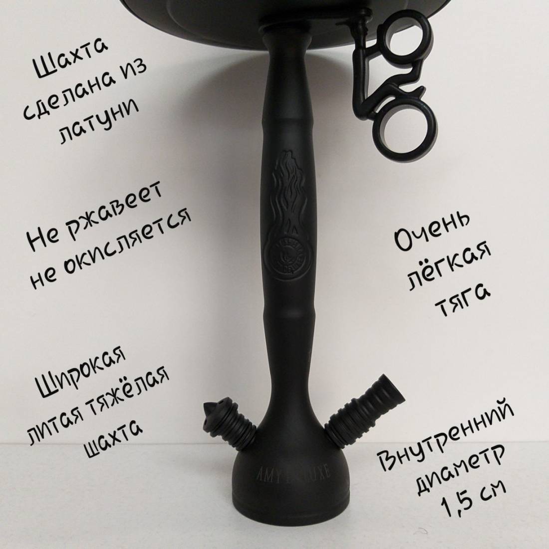 Велика перевага представленої моделі кальяну в тому, що шахта зроблено з латуні, яка абсолютно не іржавіє і не окислюється.