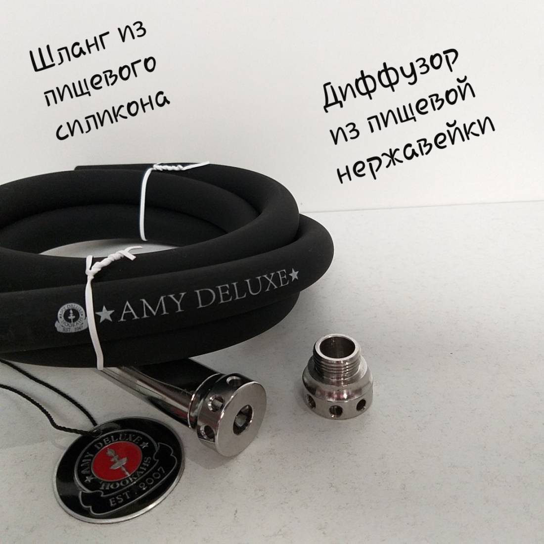 5. Шланг для кальяну Amy Deluxe 690 зроблений із харчового силікону. Сумісний абсолютно з будь-якими кальянами. Під час куріння не згинається і видає легку тягу. Не боїться ні вологи, ні пилу. Навіть розпечене вугілля не зможе пошкодити шланг.