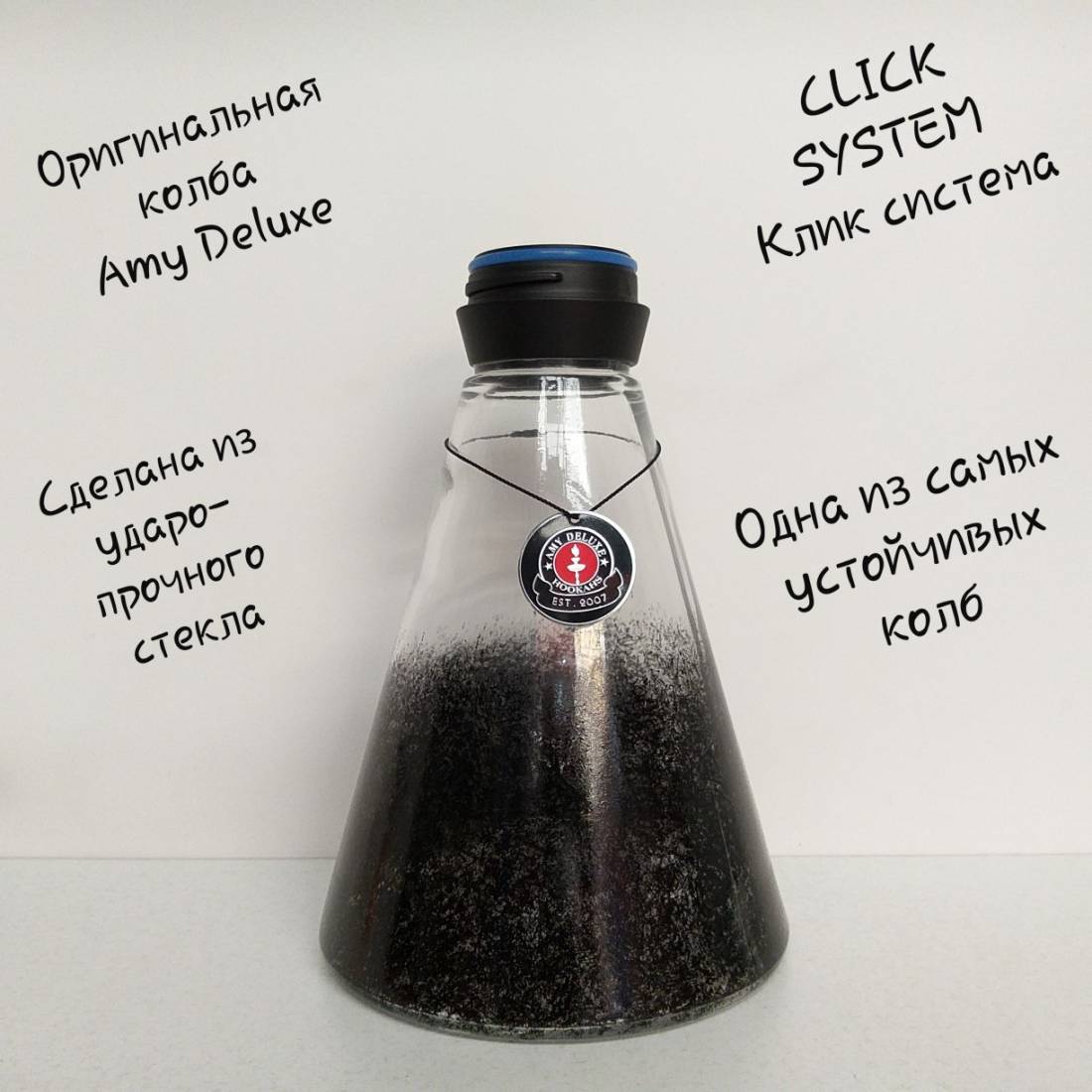 2. Найстійкіша колба у своїй ціновій категорії. Зроблена із щільного ударостійкого скла. Поєднується з шахтою клік системою. Сумісна з іншими кальянами Amy Deluxe.