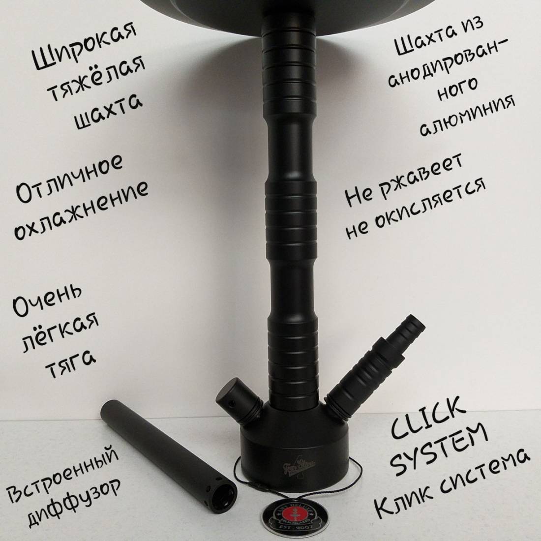 1. Шахта для кальяну не іржавіє і не окислюється. Зроблена з анодованого алюмінію. Тяжка та широка, вона добре охолоджує дим, робить смакопередачу на високому рівні. Видає дуже легкий потяг. З'єднується із колбою клік системою CLICK SYSTEM.